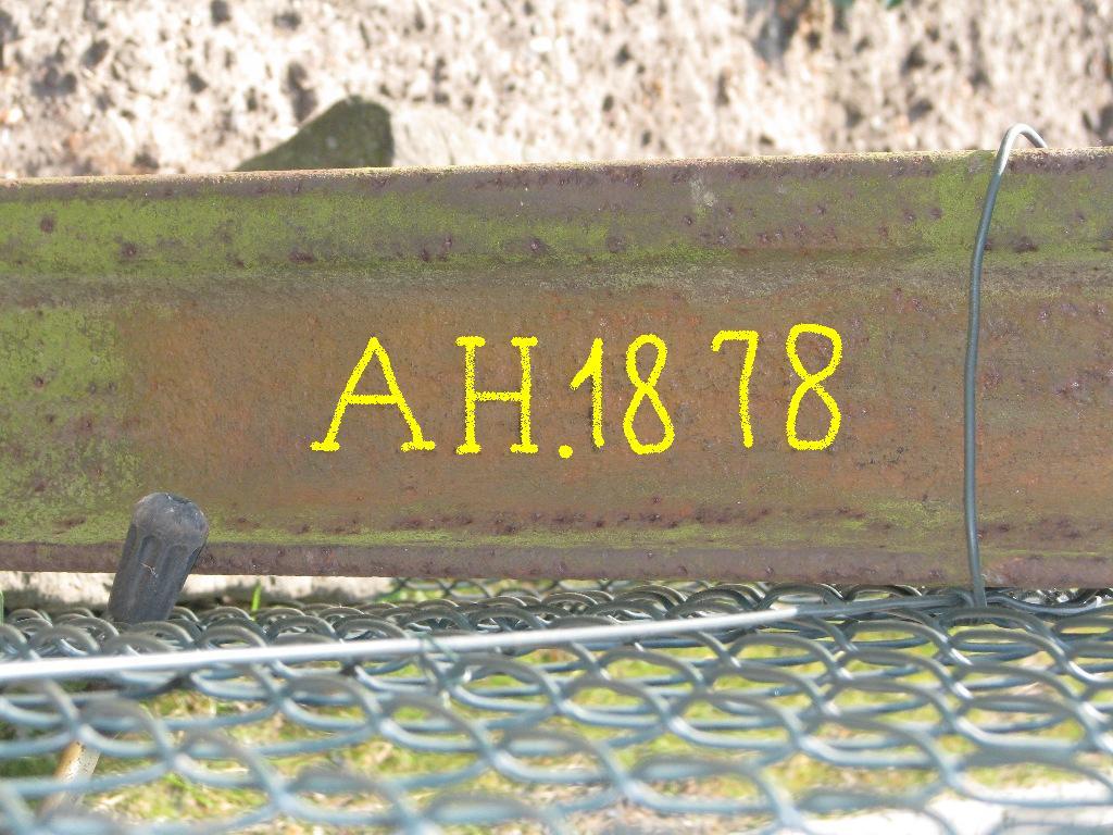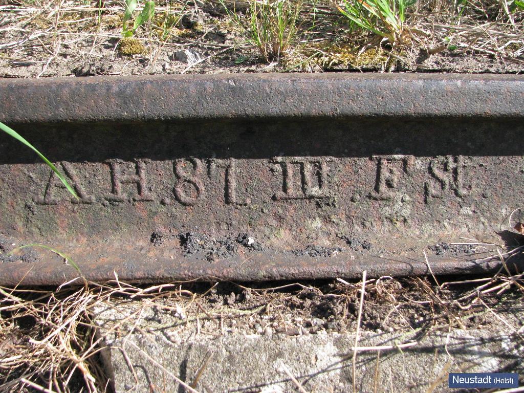 Eine Schiene zeigt das Walzzeichen „A.H.87. III. F. St„. Die Bedeutung von F.St“ ist noch unbekannt.