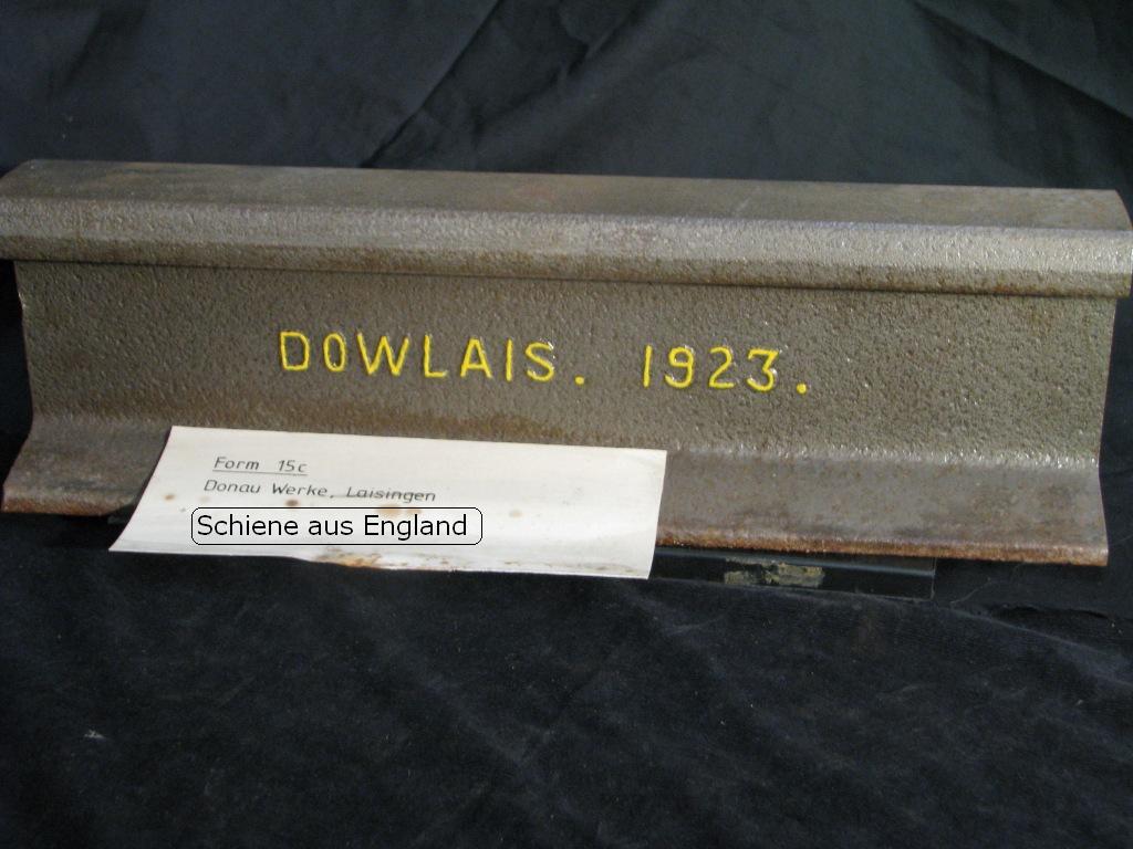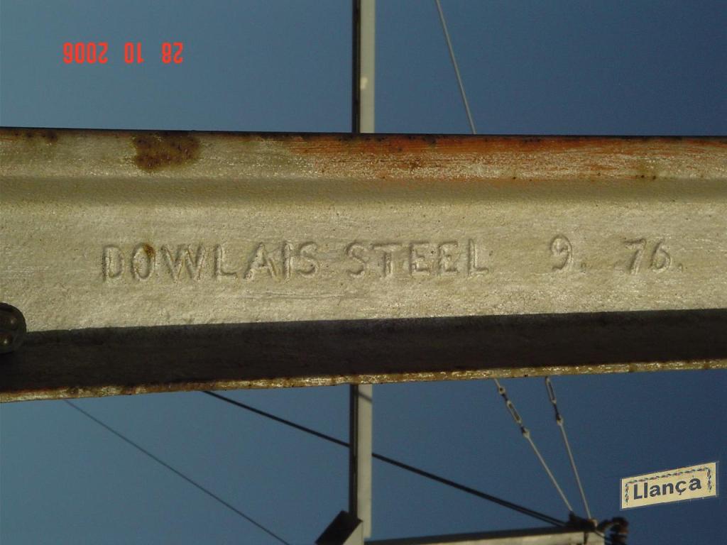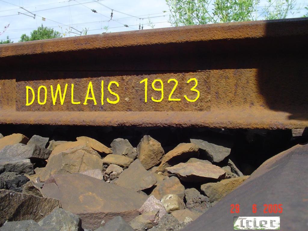 - Walzzeichen „DOWLAIS STEEL EST 1915„. Der Zusatz „EST 1915“ bei einer in Frankreich gefundenen Schiene deutet vermutlich auf ein französisches Schienenprofil hin. Das Walzjahr 1915 läßt darauf schließen, dass diese Schiene in England für das im Krieg stehende Frankreich geliefert wurde und nach der dortigen Norm gewalzt wurde.