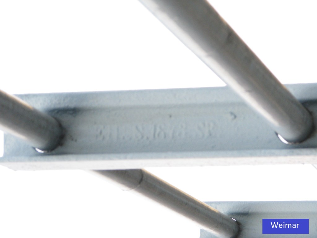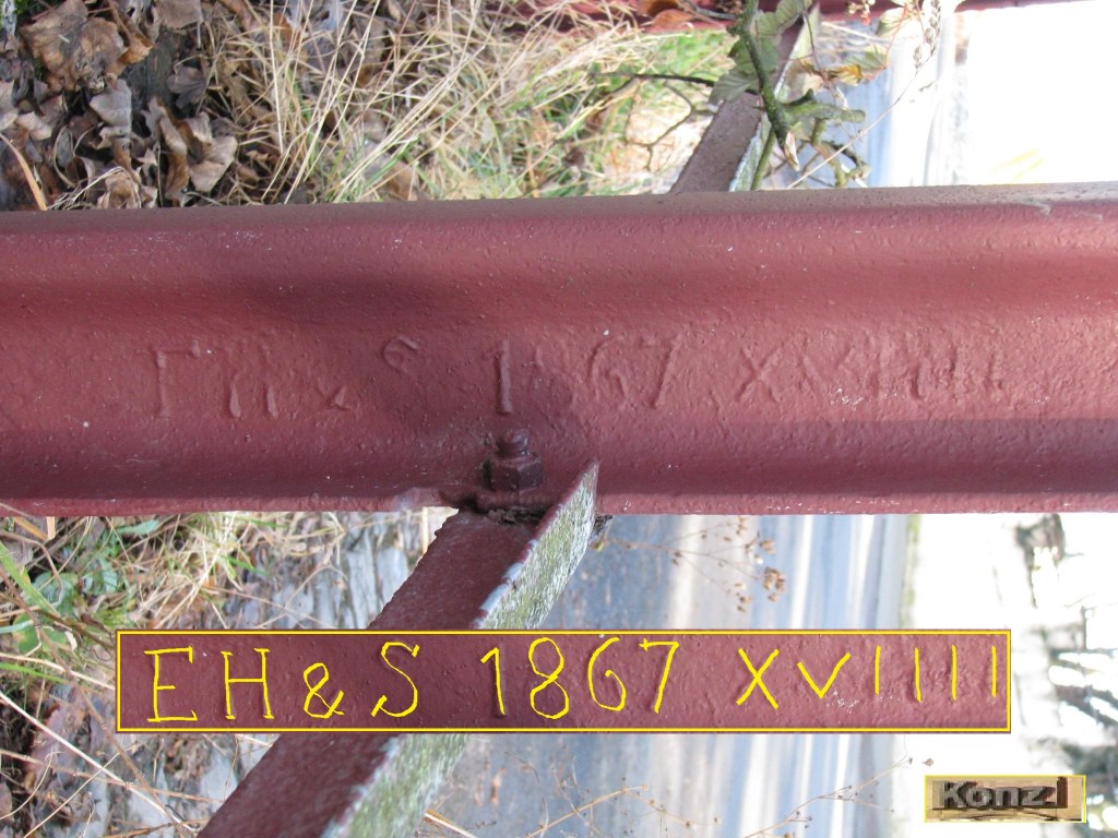 - Walzzeichen „EH&S 1872 5G„. Der Zusatz bedeutet „5 Jahre Garantie“. Sollte die Schiene bis 1877 schadhaft werden, wurde das Stahlwerk Ersatz liefern.