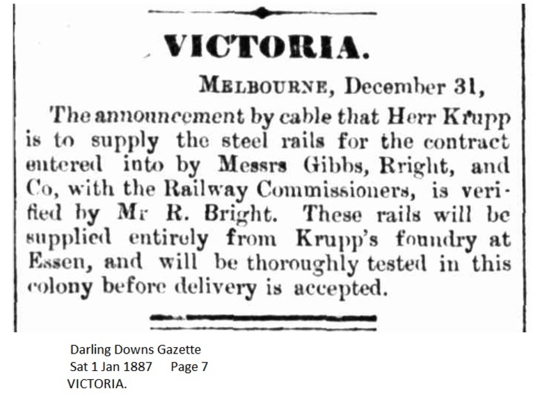Wesentlich überzeugender ist daher eine Lieferung solcher „VR„-Schienen an die Victoria Railways in Australien. Unterstützt wird dies durch einen Zeitungsartikel vom 1. Januar 1887 aus der Zeitung „Darling Downs Gazette„, der über die Geschäftsanbahnung einer solcher Lieferung berichtet.
