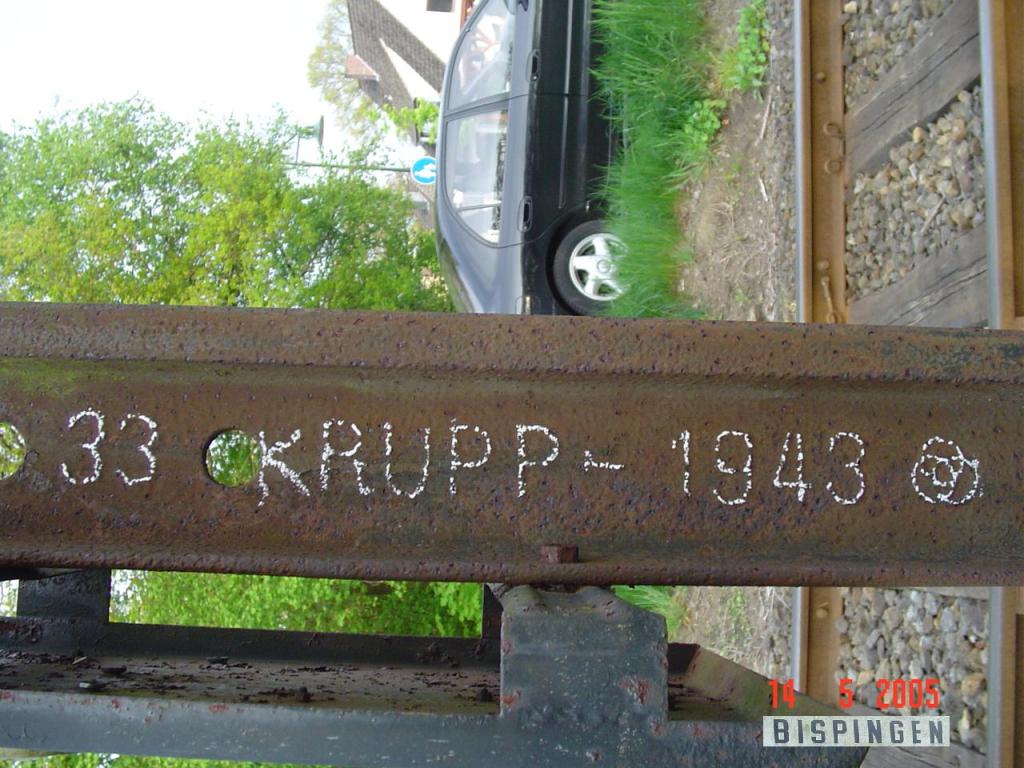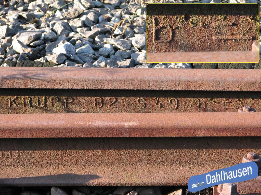 Zusatzkennzeichnung „Zu 2“ im Walzzeichen. Eine Schiene an einer Weiche zeigte ebenfalls diesen Zusatz, gewalzt von Stahl- und Walzwerk Brandenburg an der Havel (Walzzeichen „B„). Daher Vermutlich Zusammenhang zur Weiche (Abkürzung „Zungenschiene“?)