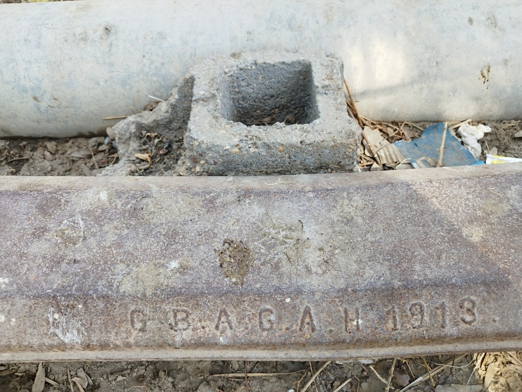 Nicht auf einer Schiene, aber auf einer Stahlschwelle findet sich das Walzzeichen „G.B.A.G.A.H 1913„. Fundort im südlichen Iraq(!), eingesendet von Mudhafar.