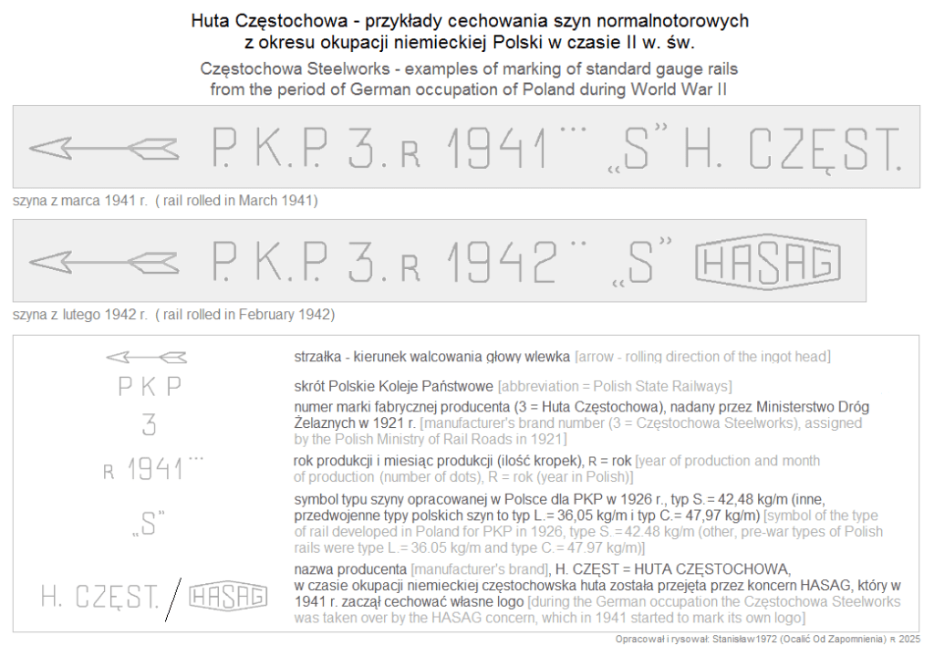 - Für die Zeit der Besetzung durch die HASAG gilt als auffällig, dass zwar das HASAG-Logo auf die Schienen gewalzt wurden, aber das Kürzel „P.K.P.“ (Abkürzung für die Polnische Staatsbahn) nicht entfernt wurde. Nach der Logik der deutschen Besatzung gab es in der Zeit keinen polnischen Staat und damit auch keine polnische Staatseisenbahn (vielmehr existierte ein „Generalgouvernement für die besetzten polnischen Gebiete„). Ebenso wurden weitere polnische Merkmale im Walzzeichen beibehalten (siehe weiter oben unter Hinweise zur Lesart ).