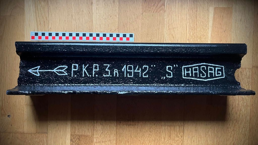 Das Walzzeichen auf der gefundenen Schienen ist leider nur in Fragmenten sichtbar. Das Firmenlogo der HASAG ist aber deutlich sichtbar.