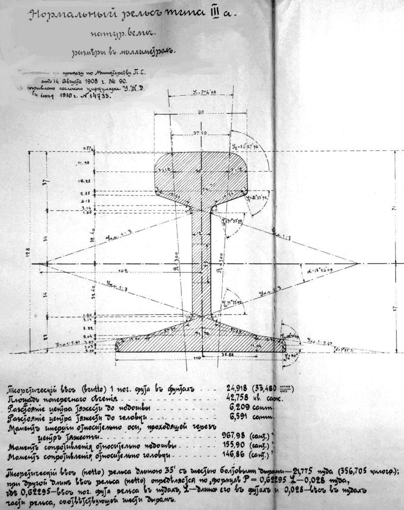Zeichnung einer 1908 entwickelten Schiene vom Typ IIIa. Walzwerke in den USA lieferten während des 1. Weltkriegs Schienen nach Russischer Norm an das gleichzeitig Krieg führende Russland.