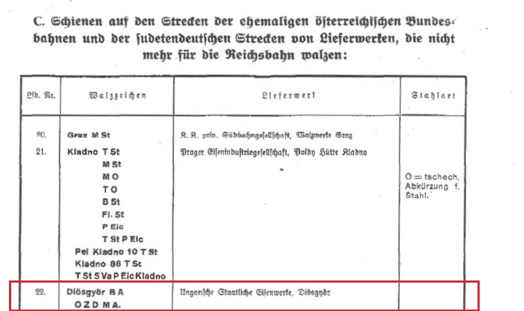 Erwähnung des Walzzeichens „OZD“ im Dokument: „Walzzeichen und besondere Kennzeichen der verschleißfesten Schienen; Abschnitt C: Schienen auf den Strecken der ehemaligen österrichischen Bundesbahnen und der sudetendeutschen Strecken von Lieferwerken, die nicht mehr für die Reichsbahn walzen“ Herausgegeben von der Deutschen Reichsbahn, Reichsbahn-Zentralamt Berlin vom 1. Juli 1937: