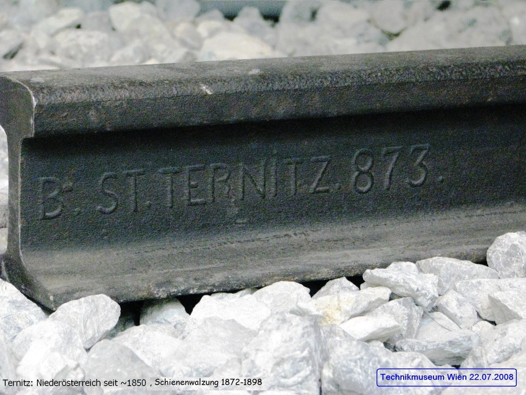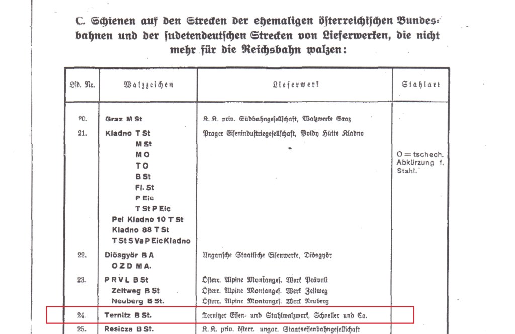 - Erwähnung des Walzzeichens „TERNITZ“ im Dokument: „Walzzeichen und besondere Kennzeichen der verschleißfesten Schienen; Abschnitt C: Schienen auf den Strecken der ehemaligen österreichischen Bundesbahnen und der sudetendeutschen Strecken von Lieferwerken, die nicht mehr für die Reichsbahn walzen“ Herausgegeben von der Deutschen Reichsbahn, Reichsbahn-Zentralamt Berlin vom 1. Juli 1937: